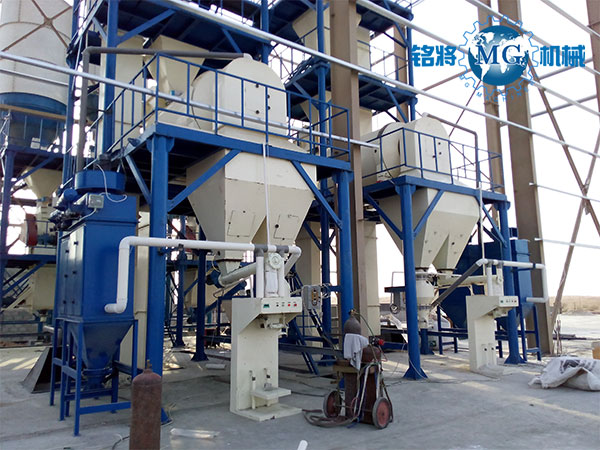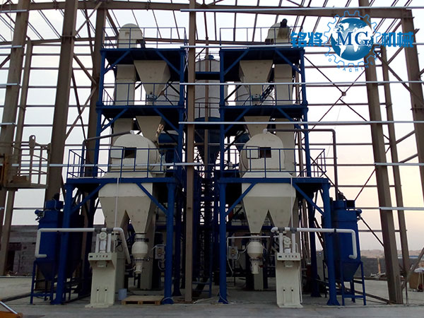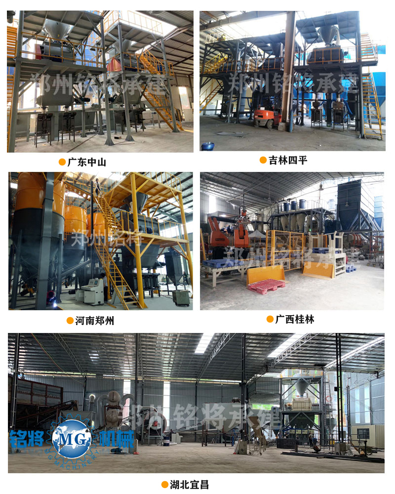 鄭州銘將機(jī)械設(shè)備有限公司研發(fā)生產(chǎn)的全自動(dòng)保溫砂漿生產(chǎn)線,一般情況下會(huì)用到4-6個(gè)原料罐,兩個(gè)大罐用于裝放散裝水泥和粉煤灰,其余小罐用于裝放輕鈣、重鈣、砂、小料等。散裝水泥和粉煤灰進(jìn)罐不需要提升設(shè)備,依靠泵車打入。輕鈣、重鈣、砂、小料等需要使用斗式提升機(jī)提入小罐,巧妙的物料分配系統(tǒng)支持一個(gè)斗式提升機(jī)分配式作業(yè),從而避免了資源浪費(fèi)。計(jì)量系統(tǒng)在計(jì)量螺旋的配合下,把料倉中的原料導(dǎo)入計(jì)量倉,通過傳感器的數(shù)據(jù)反饋,實(shí)現(xiàn)原料計(jì)量。計(jì)量好后的物料,通過螺旋輸送機(jī)導(dǎo)進(jìn)主斗提機(jī),提升到混合機(jī)上部待混料倉中。待混倉為氣動(dòng)大開門型,可以迅速將待混物料放入無重力混合機(jī),實(shí)現(xiàn)保溫砂漿連續(xù)生產(chǎn)。