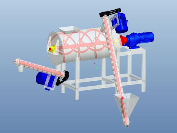該機是我公司在各地生產(chǎn)的U型臥式多螺帶混合機的基礎上多次改進而成,采用三層連續(xù)式螺條設計。該機通過攪拌軸的高速旋轉,使內(nèi)外螺旋帶在較大范圍內(nèi)翻動物料,內(nèi)螺旋帶將物料向兩側運動,外螺旋帶將物料由兩側向內(nèi)運動,使物料來回混合,同時部分物料在螺旋帶推動下,沿軸向徑向運動,從而形成對流混合,通過上述運動,物料在較短時間內(nèi)獲得快速均勻混合。