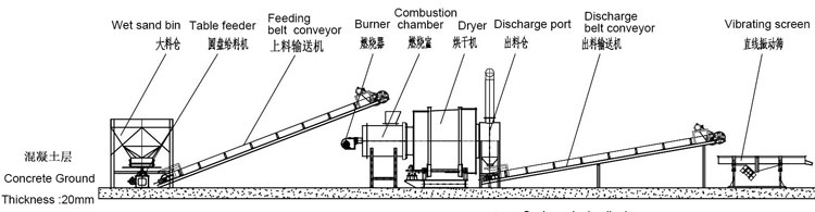石英砂烘干機(jī)是由三個(gè)不同直徑的同心圓筒按照一定的數(shù)學(xué)關(guān)系和結(jié)構(gòu)形式,彼此相嵌組合而成的。根據(jù)熱功原理,筒內(nèi)裝有不同角度和間距的揚(yáng)料板和導(dǎo)料板,這種結(jié)構(gòu)能夠保證被烘干物料在重力作用下沿著螺旋的運(yùn)動(dòng)方向運(yùn)動(dòng),在筒內(nèi)保持足夠的停留時(shí)間和充分的分散度,致使物料在筒內(nèi)與來(lái)自燃燒室內(nèi)的熱氣流進(jìn)行充分的熱交換,消除了常規(guī)烘干設(shè)備截面常出現(xiàn)風(fēng)洞而引起的熱交換面積小、單位容積蒸發(fā)強(qiáng)度低的缺陷。特殊的三筒結(jié)構(gòu),使內(nèi)筒和中筒被外筒包圍而形成了一個(gè)自身保溫系統(tǒng),內(nèi)、中筒體表面散發(fā)的熱量參與到外一層筒內(nèi)物料的熱交換,而外筒又處在熱氣流的低溫端,所以筒體的散熱面積和熱能損失明顯降低。節(jié)能型三筒烘干機(jī)能充分利用余熱,減少散熱損失,增加熱交換面積,使烘干機(jī)的單位容積蒸發(fā)強(qiáng)度大大提高,從而有效地提高了熱能利用率,降低了能耗,使石英砂烘干機(jī)的熱效率得到較大幅度的提高。