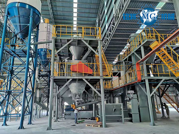 該生產(chǎn)線由儲(chǔ)料系統(tǒng)、輸送系統(tǒng)、稱(chēng)重配料系統(tǒng)、混合系統(tǒng)、成品儲(chǔ)存系統(tǒng)、包裝系統(tǒng)、除塵系統(tǒng)和電控操作系統(tǒng)等組合而成。在秉承傳統(tǒng)干粉混合生產(chǎn)線運(yùn)行穩(wěn)定、計(jì)量精確、操控簡(jiǎn)易的基礎(chǔ)上,采用頂部配料的方式,減少物料輸送行程,降低批次生產(chǎn)所需時(shí)間,提高產(chǎn)量。物料在整個(gè)生產(chǎn)流程中都在密封環(huán)境下進(jìn)行,降低灰塵。再配備我公司生產(chǎn)的高性能脈沖除塵器,大大改良生產(chǎn)環(huán)境,保證工作人員的身心健康。